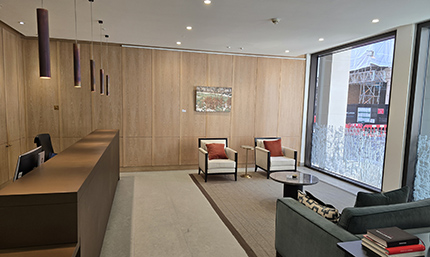 The reception area uses natural materials of exceptional quality, consistent with the commitment to deliver elegance and durability. Stone and walnut accented with bronze create a welcoming environment, while two 13-person elevators provide swift access to seven floors of office accommodation.