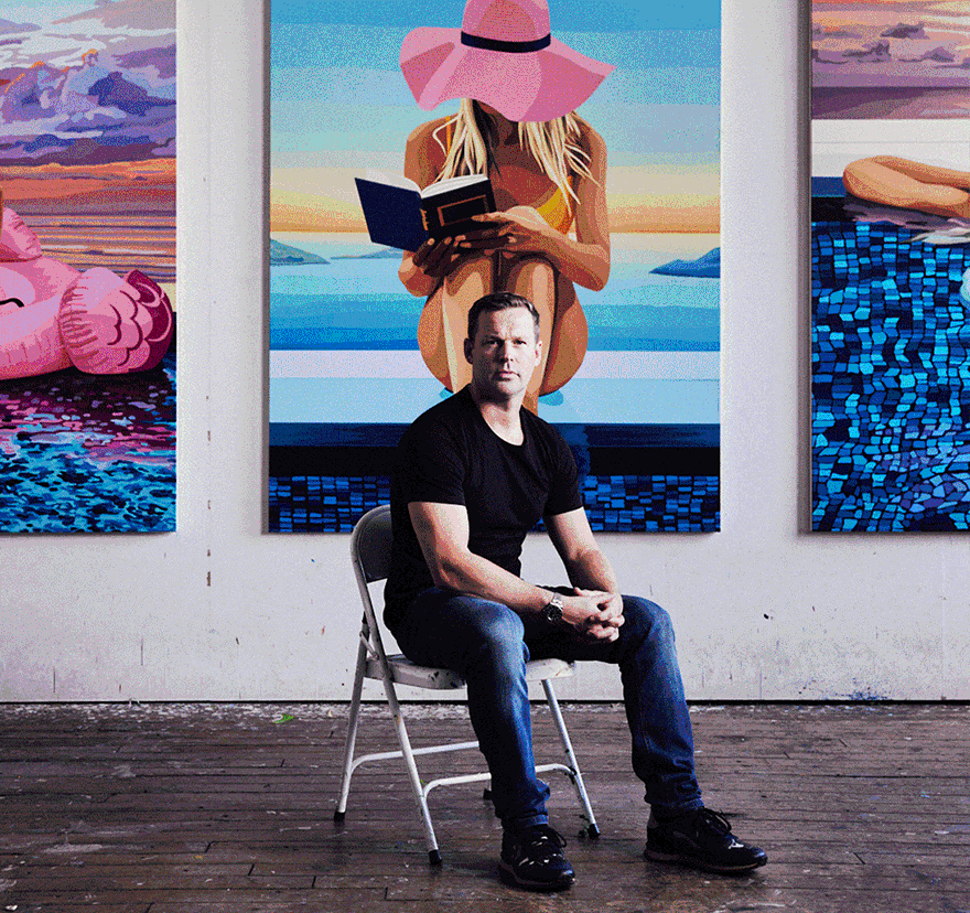 The Maddox Gallery are delighted to announce that British painter Will Martyr is the newest member of the Maddox family. Known for his dreamlike landscapes of luxury locations, Martyr's work depicts universally familiar moments of rest, relaxation, and reflection. About The Artist Seductive, relatable, dreamy, Will Martyr’s paintings depict singular moments of escapism that aim to represent those idyllic and profound moments of our lives. Featuring both urban and natural landscapes, the cropped compositions capture universally familiar moments of rest, relaxation, and reflection, in environments of unparalleled luxury. Some of these sites are recognisable, while others are hybrid locations, encouraging the viewer to transpose their own experiences and memories onto the compositions. At first glance, his meticulously painted works seem graphically composed. Yet the almost flawless surface of his canvases are the product of his laborious painting process of masking and layering. Over the past two decades, Martyr’s work has been placed in some of the most prestigious private, corporate, and institutional collections across the globe. “These poolside compositions are designed to be familiar and safe, reminding the viewer of places they have loved and laughed”. Will Martyr was born in Eastbourne in the United Kingdom in 1980. At the age of 18, he was accepted into the prestigious Slade School of Fine Art in London. During his time at The Slade, the artist experimented with colour, drawing on influences from Ellsworth Kelly, Josef Albers and Richard Diebenkorn. Martyr calls himself a colourist to this day. Following his time at The Slade, Martyr moved to New York to live and work. The city inspired him with its diverse and rich art scene and its juxtaposition of architectural genres and scale. This fed into Martyr’s early architectural paintings. Martyr returned to London in 2005 to complete his education at the Royal College of Art. He still lives and works in London today. Martyr’s illustrious education has had a profound effect on his practice. From the unconventional shape of his circular canvases, named tondos, to the hard-edged qualities of his painting, reminiscent of Pop-Art, Modernism and Italian Futurism, his artwork is heavily influenced by the history of art. Over the years, Will Martyr’s subject matter has largely been urban and natural landscapes: windows into utopian environments, fragments of interiors and narrative cut-outs. However,recently, the artist has introduced a human figure in his compositions. His wife has been his latest muse in the creation of his alluring paintings which bear titles such as “Something Special”, “Dancing across the water” or “Wherever you are its alright”.