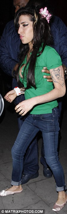 In a low cut black dress which highlighted her enhanced cleavage and her favourite ballet shoes, Amy was accompanied by goddaughter Dionne Bromfield at the Hayhill gallery for the occasion. Amy and Mitch performed September In The Rain and Fly Me To The Moon at the event in honour of human rights lawyer Julian Young. Mitch, a former London taxi driver, decided to pursue a singing career after seeing the success of his daughter. After spending months recording, his album Rush of Love, which contains covers as well as some of his own original songs, is due for release on June 7. But the night had clearly finished too early for Amy, who then changed into a more casual outfit of a green polo t-shirt and jeans for a trip to Camden. After a quick stop in The Good Mixer pub, Amy and her friend Tyler James then headed on to favourite drinking hole The Hawley Arms where they stayed until 11.30pm before returning home. As they walked down the road to get a car home, Amy started talking to one over-eager fan who insisted on picking her up, before kissing her.