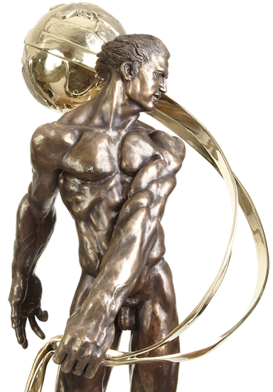 SCULPTURE In the first sculpture in the series, ATLAS SHRUGGED I: “ESCAPE TO FREEDOM”, Atlas has literally smashed his way out of the suffocating world of Collectivism, escaping to Freedom, in order to create his own perfect World (now appropriately depicted in Gold instead of Silver), a world conceived in freedom of individual rights and embodied in laissez faire Capitalism. In this, the second sculpture in the series, “ATLAS SHRUGGED II – GENESIS: A NEW GOLDEN WORLD OF INDIVIDUALISM”, Atlas has achieved his goal. He has created his own perfect world, conceived in freedom of individual rights and embodied in laissez faire Capitalism. The new golden world is now rising in the air on its own power, no longer requiring Atlas to struggle with the weight of the World on his shoulders. The new world supports itself. Atlas stands strong, pensive, reflective, poised for action. An indomitable man of purpose. Ready to forge his own individual destiny. This sculpture has been rightfully called very Rodinesque, and it is obvious that Richard was greatly influenced by Auguste Rodin, as well as by Michelangelo. Note Atlas’ dropped shoulder and extended left arm, with dramatic expressive fingers which were obviously influenced by Rodin’s “Adam” and the magnificent hands and expressive fingers of Pierre de Wissant in Rodin’s “Burghers of Calais”. You will also see the influence of Michelangelo where Richard was influenced by the Old Master’s “David”, his powerful “Day” in the Medici Chapel and the Old Masters’ “Victory” in the Palazzo Vecchio, Florence. Atlas is in bronze, with a classic rich dark brown patination. The world, and the straps holding the world, are polished Brass, reflecting a brilliant gold when the light dances on it. The circular base is polished Stainless Steel, reflecting a mirror double image of the sculpture. A turntable is hidden inside the base so the sculpture can be rotated around 360º with ease.